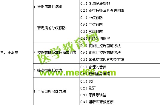 | 六、社區(qū)口腔保健 | 1.社區(qū)口腔保健 | (1)社區(qū)與社區(qū)口腔醫(yī)學(xué) (2)社區(qū)口腔保健模式 (3)WH0倡導(dǎo)的基本口腔保健 |