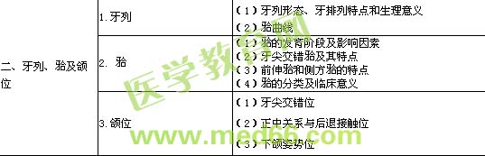 | 一、牙體解剖 | 1.牙體解剖的一般概念 | (1)牙的組成、分類及功能 (2)牙位記錄及牙的萌出 (3)牙體解剖的應(yīng)用術(shù)語及解剖標(biāo)志 |