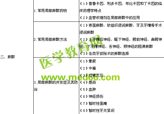 | 5.創(chuàng)口處理 | (1)創(chuàng)口分類、愈合及處理原則 (2)換藥的基本原則、注意事項及換藥技術 (3)繃帶包扎的目的 (4)口腔頜面部常用繃帶類型及應用 | |
