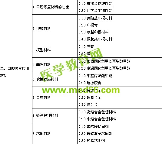 | 2.治療設(shè)計(jì)及方法選擇 | (1)修復(fù)治療原則 (2)固位原理 (3)牙體缺損的修復(fù)方法 (4)各類修復(fù)的適應(yīng)證與禁忌證 (5)金瓷結(jié)合機(jī)制 | |