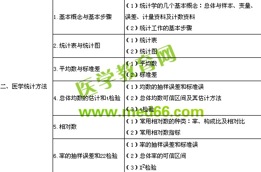 | 3.常用流行病學(xué)研究方法 | (1)概述:流行病學(xué)方法分類、流行病學(xué)研究設(shè)計(jì)的基本內(nèi)容 (2)描述流行病學(xué):描述流行病學(xué)的概念、現(xiàn)況研究的概念、普查與抽樣調(diào)查的概念、抽樣方法及樣本含量的估計(jì) (3)分析流行病學(xué):分析流行病學(xué)的概念及分類;病例對照研究的概念、研究對象的選擇、樣本含量的估計(jì)、資料的統(tǒng)計(jì)分析、優(yōu)點(diǎn)和局限性;隊(duì)列研究的概念、用途、種類、研究對象的選擇、樣本含量的估計(jì)、資料分析、優(yōu)點(diǎn)及局限性 | |