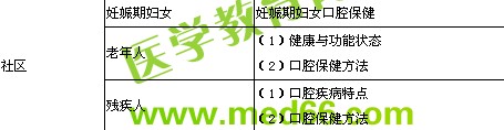 | 學?!?/td> | 中、小學生 | (1)口腔保健特點 (2)口腔保健方法 | |