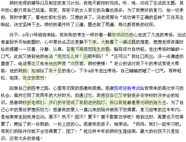 一晃十多年過去了,考試對我來說確實不是一件容易的事,歲月不饒人,記憶更不留情,不甘心的我又一次參加了國家執(zhí)業(yè)醫(yī)師考試的隊伍來,但2008年失敗的教訓至今還縈繞在心,內(nèi)心那份膽怯還是揮不去的,帶著膽怯、抱著再試一次的心情去網(wǎng)上報名的網(wǎng)站。通過同學、老公的鼓勵才報名,網(wǎng)上報名那一刻我還是猶豫不決的,現(xiàn)場確認那天由于某種原因沒報上,我又灰心了,心想“干脆不考了,真麻煩”。還是他的勸說,4月11號我又去了現(xiàn)場報名地,至那一刻起,心中就給自己一份寄托,既然報了,就要堅持下去,堅持就會有希望,就這樣2011年的上半年,是書陪我度過了每一個黑夜白晝。后來通過一同學的介紹認識了網(wǎng)校,試聽了幾位老師的精彩講解,內(nèi)心增加了好多自信,隨機報了網(wǎng)校一個培訓班。聽課、看書、做題,一連串的內(nèi)容一一熟悉一遍。每個章節(jié)都有的數(shù)字、英文名詞我都會記在一個小本子上,裝在兜里,沒事就拿出來看一遍,直到考試那天。整理的試題集放在床頭,晚上聽完講義臨休息時再翻一遍,每晚床頭燈不能開,怕影響老公休息,就用手電筒光照明,看著看著就睡著了。那段時間仿佛只有那樣才能睡的安穩(wěn)。就這樣熬啊、熬啊、熬出了神經(jīng)衰弱,晚上睡不著,白天沒精神。曾想過再次放棄,但網(wǎng)校老師那句“成功等于正確的堅持”依然銘記在心,咬咬牙還是堅持下來了。