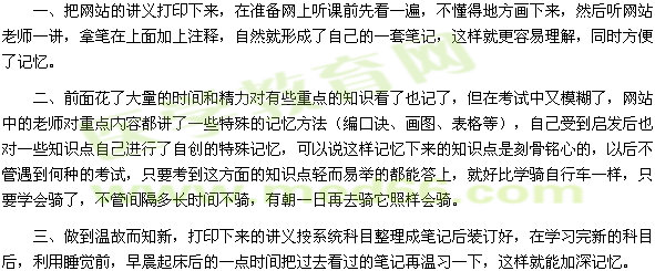 五、重視課后練習(xí)及歷年考點,復(fù)習(xí)過程中做題是必須的,但不能僅僅停留在這一層面,還應(yīng)該更多掌握試題背后的知識,有的考點是反復(fù)出現(xiàn)的,只是考察的形式有所不同。我的做法是把試題中考察的考點用不同顏色的筆在筆記上標(biāo)注、突出,利用試題對照,把考點知識真正讀通、讀透。 完成模擬試題,找出自己掌握知識的薄弱點,進(jìn)一步加以鞏固,還能通過練習(xí),了解考試的出題方式、考試側(cè)重點,以便在應(yīng)試時能心中有數(shù)。