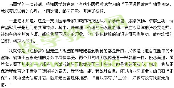 在這喜悅的日子里,我不僅感謝默默支持和鼓勵我的老公,更要感謝醫(yī)學教育網(wǎng)在我執(zhí)業(yè)醫(yī)師考試道路上的莫大幫助和指導。激動之余,與“正保遠程教育”相伴的點點滴滴如戀愛時與老公相處的一幕幕鏡頭,歷歷在目。
