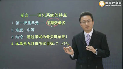 教師簡介:醫(yī)學(xué)教育網(wǎng)醫(yī)學(xué)總監(jiān),醫(yī)學(xué)碩士。他講課風(fēng)格鮮明,內(nèi)容上堅持“不擇一切手段記住重要知識點”的教學(xué)思路,綜合運用表格、口訣、圖片、FLASH和圖示等多種手段強化重要考點;形式上絕對摒棄平鋪直敘式的講述,而是將枯燥的醫(yī)學(xué)知識跟常見事物聯(lián)系起來,力求生動活潑,深入淺出。