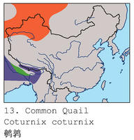 指名亞種在新疆維吾爾自治區(qū)繁殖,遷徙至西藏自治區(qū)南部越冬。野生鵪鶉在中國分布于東北、新疆,遷徙遍全國。野生鵪鶉分布廣泛。四川省產地有:成都、重慶、涪陵、樂山、南充、雅安、涼山、阿壩、甘孜等地、市、州。省外黑龍江、吉林、遼寧、青海、河北、河南、山東省的嘉祥賈橋村、山西、安徽、云南、福建、廣東、海南島及臺灣等省區(qū)也有分布。中國1952年以來,引進鵪鶉家養(yǎng)品種,現(xiàn)已在四川、黑龍江、吉林、遼寧、青海、河北、河南省、山東、山西、安徽、云南、福建、廣東、海南島及臺灣等省區(qū)均有養(yǎng)殖。
