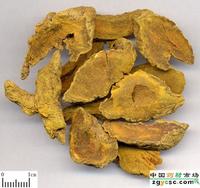 【性狀】本品呈不規(guī)則卵圓形、圓柱形或紡錘形,常彎曲,有的具短叉狀分枝,長2~5cm,直徑1~3cm。表面深黃色,粗糙,有皺縮紋理和明顯環(huán)節(jié),并有圓形分枝痕及須根痕。質(zhì)堅(jiān)實(shí),不易折斷,斷面棕黃色至金黃色,角質(zhì)樣,有蠟樣光澤,內(nèi)皮層環(huán)紋明顯,維管束呈點(diǎn)狀散在。氣香特異,味苦、辛。