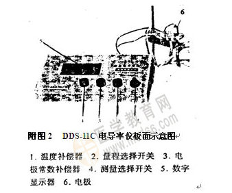 除可用交流電橋法外,目前多數(shù)采用電導(dǎo)率儀進(jìn)行。其特點(diǎn)是測量范圍廣,快速直接和操作方便。電導(dǎo)率儀的類型有多種,但基本原理大致相同,此僅以DDS-11C數(shù)顯電導(dǎo)率儀為例(見圖2 DDS-11C電導(dǎo)率儀板面示意圖),說明其使用方法。