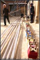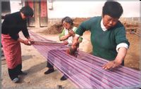 牽機就是一道非常重要的工序,將纏好的線錠按照一定的順序擺在地上,然后一根根地將線牽引、編整在一起,這道工序直接決定著所要織成布的長短、寬窄和花色。兩個錠架相隔約10米,按照所要織成布的寬窄不同,人要在兩個錠架之間來回纏繞幾百根棉線,忙活一天下來,足足要走幾十里地,這可不是個輕快活。