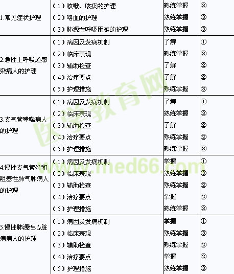 | 三、循環(huán)系統(tǒng)疾病病人的護理 | 1.常見癥狀護理 | (1)循環(huán)系統(tǒng)解剖生理 (2)心源性呼吸困難護理 (3)心前區(qū)疼痛護理 (4)心悸護理 (5)心源性水腫護理 (6)暈厥護理 |