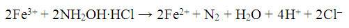 此配合物的lgK穩(wěn)=21.3,摩爾吸光系數(shù)ε510=1.1×104L·mol-1·cm-1,而Fe3+能與鄰二氮菲生成3∶1配合物,呈淡藍(lán)色,lgK穩(wěn)=14.1。所以在加入顯色劑之前,應(yīng)用鹽酸羥胺(NH2OH·HCl)將Fe3+還原為Fe2+,其反應(yīng)式如下:
