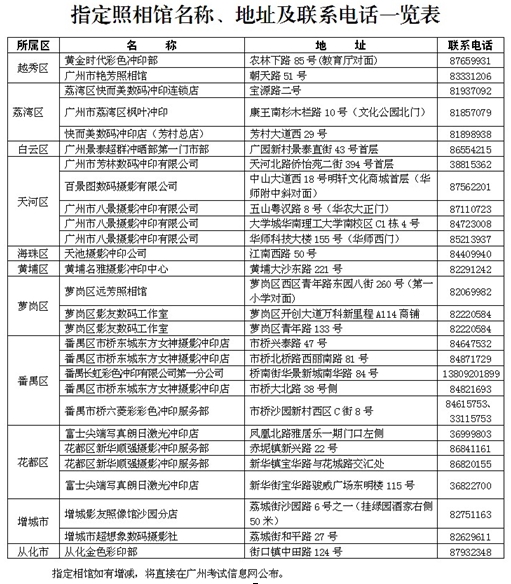 1. 考生網(wǎng)上填寫個人資料后,打印照相憑條到指定照相館(見附件2)照相,并由該照相館在24小時內(nèi)直接將相片上傳到報名系統(tǒng)中,或考生自行攜帶符合規(guī)格的相片(見附件3)電子版、報名表、身份證原件和復(fù)印件,到廣州市人事考試中心(地址:廣州市小北路266號北秀大廈8樓)核對后上傳相片。