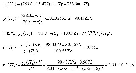 例題:1-4、某學生在實驗室中用金屬鋅與鹽酸反應制取氫氣。所得到的氫氣用排水集氣法在水面上收集。溫度為18℃,室內(nèi)氣壓計為753.8mmHg,濕氫氣體積為0.567L.用分子篩除去水分,得到干氫氣。計算同樣溫度\壓力下干氫氣的體積以及氫氣的物質(zhì)的量。