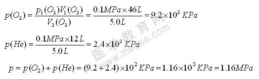 例題:1-3、在潛水員自身攜帶的水下呼吸器中充有氧氣和氦氣混合氣體(氮氣在血液中溶解度較大,易導致潛水員患上氣栓病,所以以氦氣代替氮氣)。對一特定的潛水操作來說,將25℃,0.10Mpa的46LO2和25℃,0.10Mpa的12Lhe充入體積為5.0L的儲罐中,計算25℃下在該罐中兩種氣體的分壓和混合氣體的總壓。