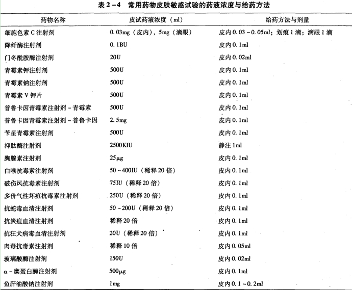 《中華人民共和國藥典臨床用藥須知》(2010年版)中規(guī)定必須做皮膚敏感試驗的藥物見表2-4