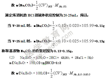 3分別以硼砂、無水碳酸鈉為基準物標定0.10mol·L-1HCl溶液時,應稱取的硼砂、無水碳酸鈉的質(zhì)量如何計算?