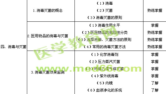 | 2.醫(yī)院環(huán)境的清潔與消毒 | 環(huán)境的清潔與消毒的原則和方法 | 熟練掌握 | ||||