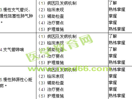 | 6.支氣管擴張癥 | (1)病因及發(fā)病機制 (2)臨床表現(xiàn) (3)治療要點 (4)護理措施 |