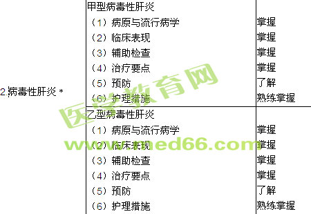 | 6.肝性腦病﹡ | (1)病因及發(fā)病機制 (2)臨床表現(xiàn) (3)輔助檢查 (4)治療要點 (5)護理措施 |