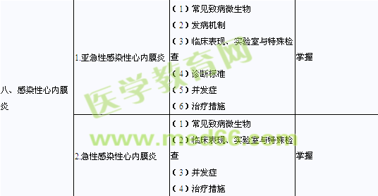 | 十、心包炎* | 1.急性心包炎 | (1)病因 (2)臨床表現(xiàn) (3)X線和超聲心動圖檢查 (4)治療 (5)心臟壓塞的診斷與處理 (6)心包穿刺術(shù)的指征和注意事項醫(yī)|學(xué)教育網(wǎng)搜集整理 |
