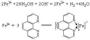 鄰菲啰啉(鄰二氮雜菲)是目前分光光度法測定鐵含量的較好試劑。在pH=2~9的溶液中試劑與Fe2+生成穩(wěn)定的紅色配合物。該反應中鐵必須是亞鐵狀態(tài),因此,在顯色前要加入還原劑,如鹽酸羥胺翳學教育網(wǎng)搜集整理。反應如下: