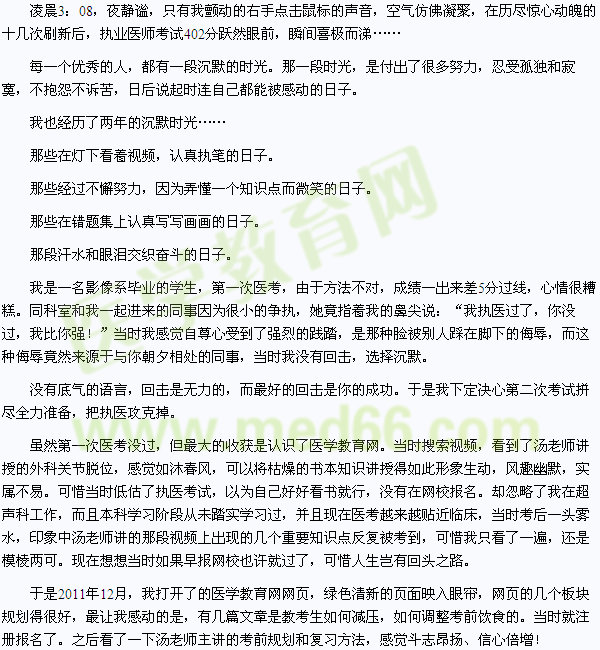 在執(zhí)業(yè)醫(yī)師考試的兩年戰(zhàn)役里,我收獲的不僅僅是分數(shù),還有執(zhí)著、耐力、克制力,以及那種不服輸?shù)木?,我成長了,也成熟了。