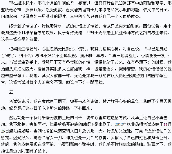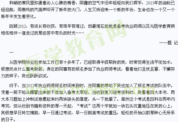 編者按:醫(yī)學(xué)教育網(wǎng)“我的醫(yī)考之路”大型征文活動中很多的學(xué)員踴躍參加,執(zhí)業(yè)藥師學(xué)員xixi***根據(jù)自己2012年的醫(yī)師考試經(jīng)驗,記錄下:我的醫(yī)考之路——向著夢想出發(fā),感謝一路有你相伴: