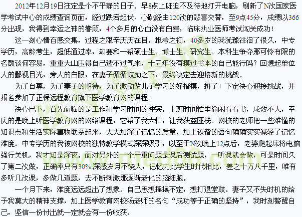 縱觀這次醫(yī)考之路,如果沒(méi)有正保遠(yuǎn)程教育背后優(yōu)秀的師資力量,沒(méi)有妻子的鼓勵(lì),沒(méi)有醫(yī)學(xué)教育網(wǎng)全體敬業(yè)老師的陪伴,要取得成功是很難想象的。雖然低分,但我過(guò)了,我勝利了!我想說(shuō):“我愛(ài)你們,我的妻子,我的網(wǎng)校的老師!”
