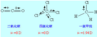 例如:二氧化碳雖然有兩個極性的C=O鍵,但是由于它是線性對稱的分子,鍵的極性互相抵消了,偶極矩為零,分子沒有極性,;四氯化碳分子,碳氯鍵都是極性鍵,但是它的偶極矩為零,這也是由于完全對稱的正四面體排列,使其極性正好彼此抵消;在氯甲烷中,主要是碳-氯鍵的極性決定分子的極性,其分子偶極矩為1 .94D.