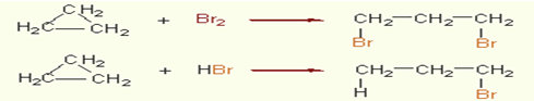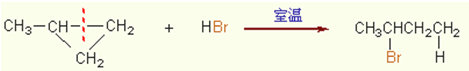 當(dāng)環(huán)丙烷的烷基衍生物與氫鹵酸作用時(shí),碳環(huán)開環(huán)多發(fā)生在連氫原子最多和連氫原子最少的兩個(gè)碳原子之間。氫鹵酸中的氫原子加在連氫原子較多的碳原子上,而鹵原子則加在連氫原子較少的碳原子上。例如:
