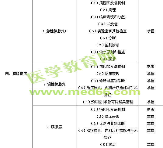 | 三、肝臟疾病 | 1.肝硬化* | (1)病因 (2)病理 (3)臨床表現(xiàn) (4)并發(fā)癥 (5)實驗室及其他檢查 (6)診斷 (7)鑒別診斷 (8)治療 |