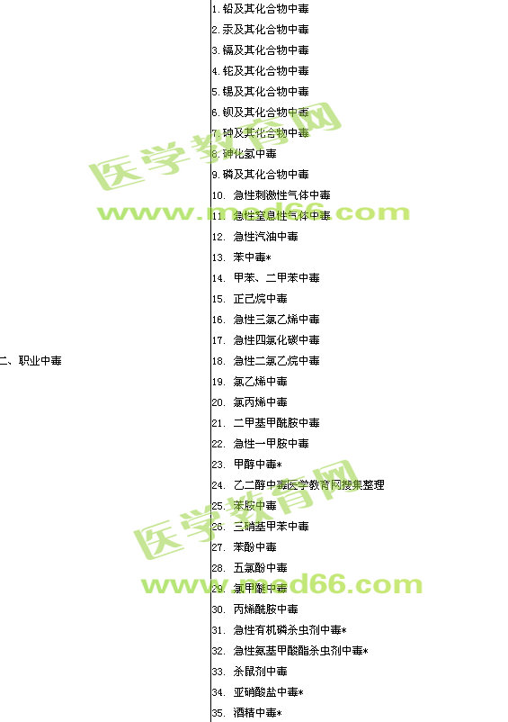 | 一、職業(yè)有害因素引起的器官或系統(tǒng)損害 | 1.中毒性腦病 2.中毒性周圍神經(jīng)病 3.中毒性肺水腫 4.纖維化性肺病 5.中毒性肝病 6.職業(yè)性造血系統(tǒng)疾病 7.中毒性腎病 8.職業(yè)性皮膚損害 9.職業(yè)性眼部損害 |