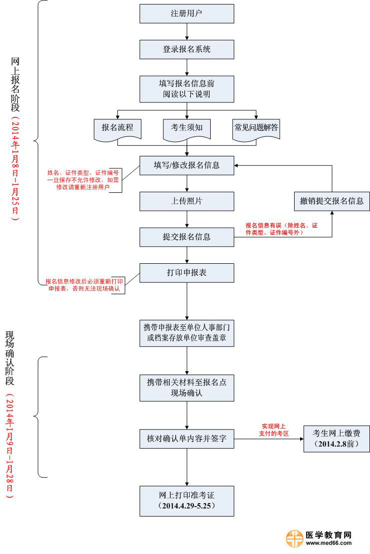 2014年度全國衛(wèi)生專業(yè)技術(shù)資格考試已經(jīng)于1月8日開始報名,醫(yī)學(xué)教育網(wǎng)搜集|整理報名流程圖如下:(點擊查看大圖)
