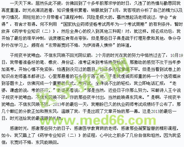 我之所以如此失態(tài)激動,因為我知道自己是多么在乎多么努力。世間自有公道,付出總有回報,我的這份成功離不開那些日子的付出,更離不開醫(yī)學教育網(wǎng)校老師們的幫助。說起醫(yī)學教育網(wǎng)校,由衷而言,這是繼娶了溫柔賢惠的愛人之后,我人生的又一次正確選擇。
