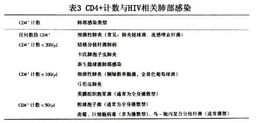 HIV/AIDS患者CD4細胞數(shù)量與肺部感染病原體類型密切相關,如鳥-胞內(nèi)復合分枝桿菌主要見于免疫功能嚴重受損者CD4計數(shù)<50/μl.CD4計數(shù)均數(shù)與主要肺部感染病原體類型關系詳見表3.