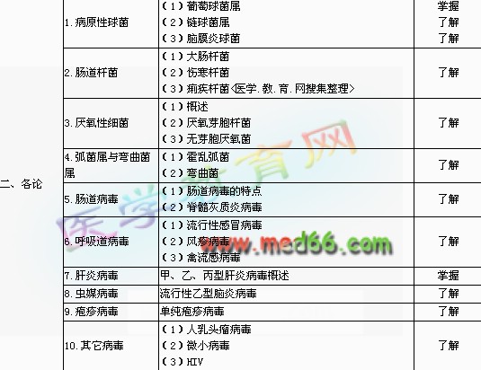 | 一、總論 | 1.緒論 | (1)微生物與微生物概述 (2)醫(yī)學(xué)(病原)微生物學(xué) | 掌握 |