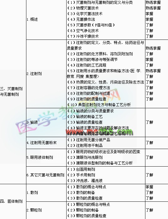 | 3.中藥成方制劑的制備工藝與質(zhì)量控制 | (1)中藥顆粒劑、口服液、片劑、膠囊劑及注射劑 (2)中藥軟膏劑、栓劑、涂抹劑、硬膏劑、巴布劑 | 了解 | |