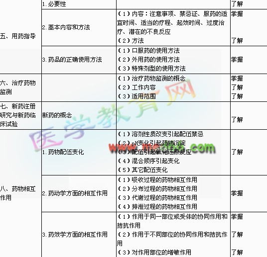 | 4.藥源性疾病 | (1)藥源性疾病的概念 (2)常用藥品的主要不良反應(yīng)與常用藥物致常見藥源性疾病發(fā)生原因、臨床特點(diǎn)、防治原則 | 了解 | |