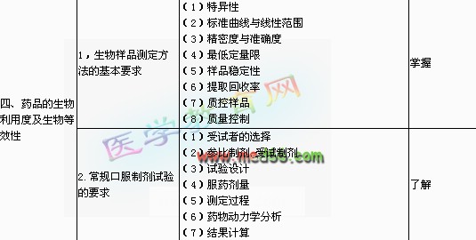 | 二、藥品質(zhì)量控制 | 1.通則 | (1)藥檢的任務(wù)和技術(shù)要求 (2)醫(yī)院內(nèi)部藥品流通環(huán)節(jié)的質(zhì)量監(jiān)控質(zhì)量跟蹤報(bào)告制度 (3)藥檢過程:取樣、登記、檢驗(yàn)、記錄及報(bào)告等步驟 (4)藥品質(zhì)量控制的常見通用項(xiàng)目:重量差異或裝量差異、含量、含量均勻度、釋放度、溶出度、融變時(shí)限、崩解時(shí)限、微生物限度、無菌、不溶性微粒的概念及意義 (5)藥品質(zhì)量控制的常見通用項(xiàng)目:重量差異或裝量差異、含量、含量均勻度、釋放度、溶出度、融變時(shí)限、崩解時(shí)限、微生物限度、無菌、不溶性微粒的法定檢查方法及結(jié)果判定 (6)醫(yī)院用主要?jiǎng)┬偷馁|(zhì)量要求 | 掌握 掌握 掌握 掌握 掌握 熟練掌握 |
