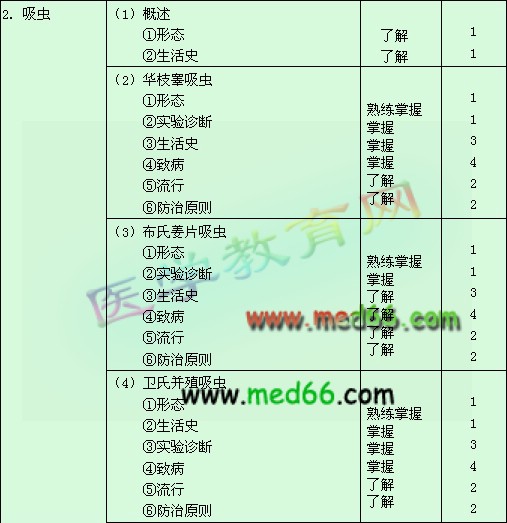 | (6)日本血吸蟲 ①形態(tài) ②生活史 ③致病 ④免疫 ⑤實(shí)驗(yàn)診斷 ⑥流行 ⑦防治原則 | 熟練掌握 掌握 了解 了解 掌握 了解 了解 | 1 1 3 2 4 2 2 | ||