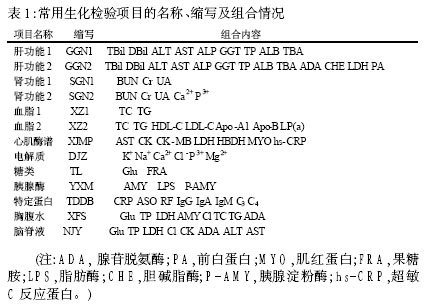 由于醫(yī)院實(shí)驗(yàn)室自動(dòng)生化分析儀品牌型號(hào)的不同,普遍的生化分析儀項(xiàng)目設(shè)置一般都在30多個(gè)項(xiàng)目以上。根據(jù)幾年來的實(shí)驗(yàn)室資料數(shù)據(jù)中分析,一般醫(yī)院各類組合的申請(qǐng)單使用頻率大多分別為肝功能>生化全套(肝功能+腎功能+血脂+糖+電解質(zhì))>血脂全套>腎功能>糖類>電解質(zhì)>特定蛋白>心肌酶譜>胰腺酶>胸腹水。具體組合內(nèi)容見表1。