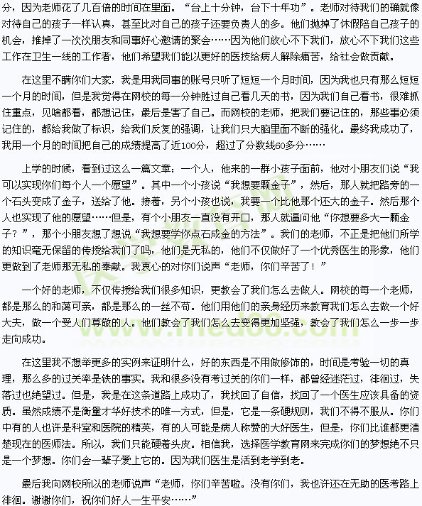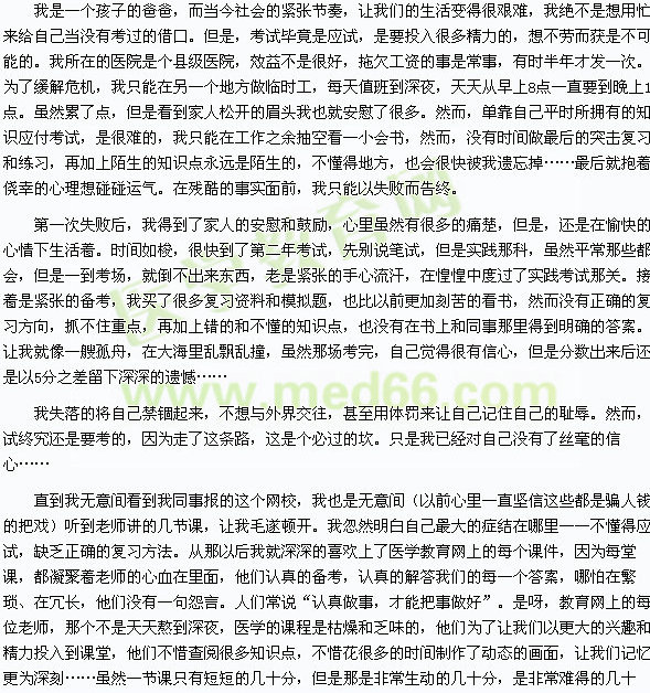 編者按:在醫(yī)學(xué)教育網(wǎng)“我的醫(yī)考之路”大型征文活動中涌現(xiàn)出很多考生原創(chuàng)的經(jīng)典文章,其中有位醫(yī)師考生根據(jù)其備戰(zhàn)醫(yī)師考試的親身經(jīng)歷,記錄下了“我的醫(yī)考之路——遇到它是我的榮幸”!