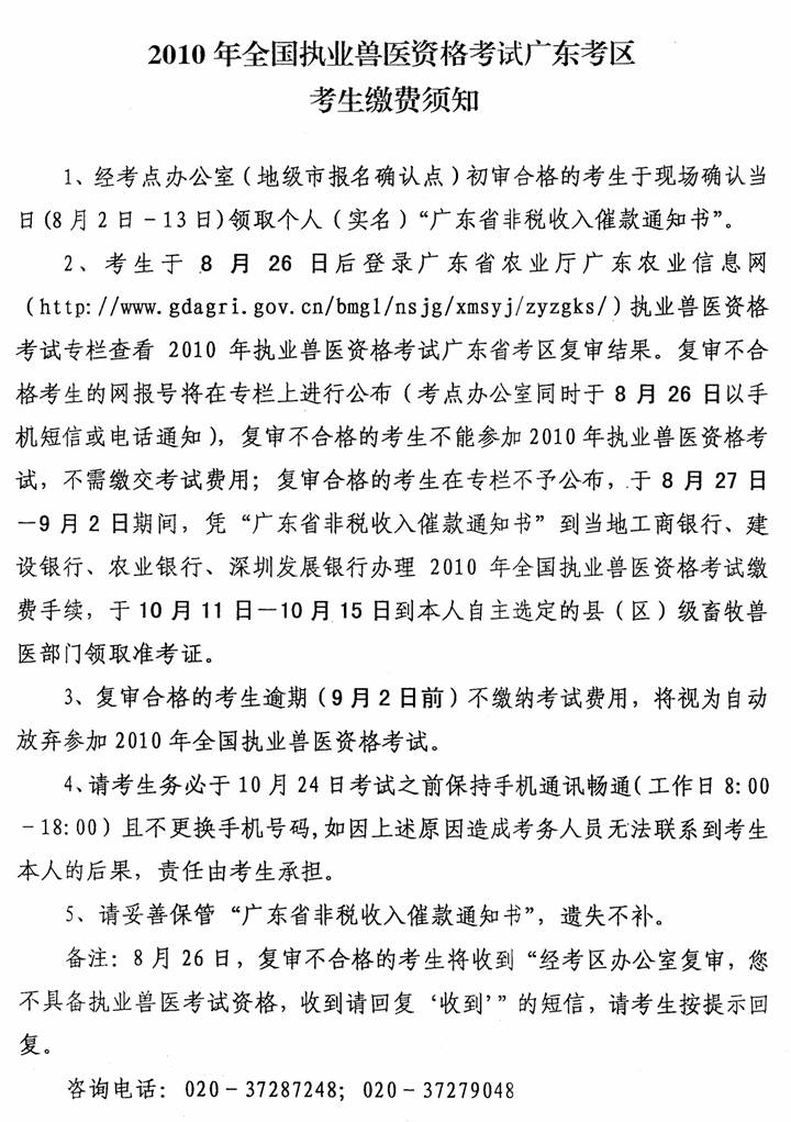 2010年全國(guó)執(zhí)業(yè)獸醫(yī)資格考試廣東考區(qū)考生繳費(fèi)須知