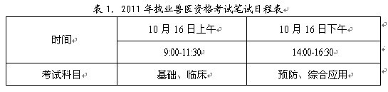 2011年執(zhí)業(yè)獸醫(yī)資格考試時間為10月16日。上午舉行基礎(chǔ)、臨床兩個科目筆試;下午舉行預(yù)防、綜合應(yīng)用兩個科目筆試,上、下午考試時間各150分鐘,考試時間共計5個小時