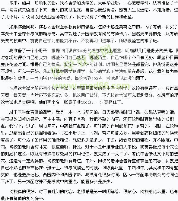 編者按:醫(yī)學教育網(wǎng)“我的醫(yī)考之路”大型征文活動中很多的學員踴躍參加,中醫(yī)執(zhí)業(yè)醫(yī)師學員根據(jù)自己2010年的醫(yī)師考試經(jīng)歷,記錄下:我的醫(yī)考之路——收獲的日子: