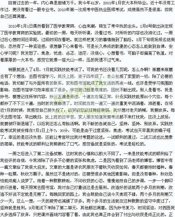 編者按:醫(yī)學(xué)教育網(wǎng)“我的醫(yī)考之路”大型征文活動中很多的學(xué)員踴躍參加,中醫(yī)執(zhí)業(yè)醫(yī)師學(xué)員根據(jù)自己2010年的醫(yī)師考試經(jīng)歷,記錄下:我的醫(yī)考之路——默默耕耘 天道酬勤: