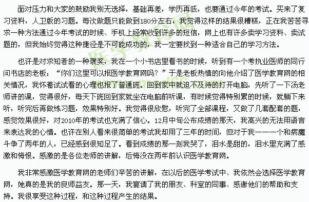 編者按:在醫(yī)學(xué)教育網(wǎng)“我的醫(yī)考之路”大型征文活動中有很多的學(xué)員踴躍參與,其中一位助理醫(yī)師學(xué)員根據(jù)自己2010年助理醫(yī)師考試的經(jīng)驗,寫下了《我的醫(yī)考之路——感恩的心》一文,與廣大奮斗在2011年醫(yī)學(xué)考試第一線的朋友們分享!