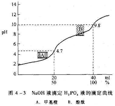 從圖4-3可以看出: ?。?)曲線上有兩個突躍,但范圍都較小,可選擇甲基橙和酚酞的混合醫(yī)|學教育網(wǎng)搜集整理指示劑來判斷終點。 (2)多元酸要以兩個原則來判斷: ?、倌芊癖坏味☉訡·Kan≥10 -8為準; ?、谀芊穹植奖坏味ㄈQ于Kan/Kan+1≥104。