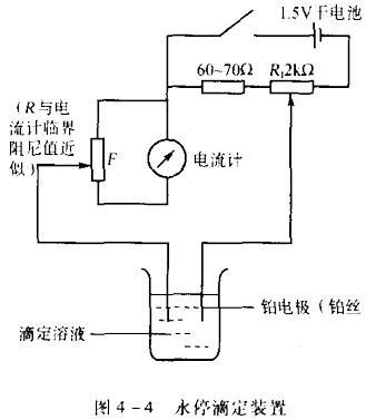 《中國藥典》采用永停滴定法指示終點(diǎn)。永停滴定法裝置如圖4-4所示。永停滴定法采用兩支相同的鉑電極,當(dāng)在兩電極間加一低電壓(如50mV)時(shí),電極在溶液中極化,在滴定終點(diǎn)前,僅有很小或無電流通過;但當(dāng)?shù)竭_(dá)終點(diǎn)時(shí),微過量的滴定液生成醫(yī)|學(xué)教育網(wǎng)搜集整理的亞硝酸(HN02)及其分解產(chǎn)物(NO)為可逆電對(duì),在電極上可發(fā)生氧化還原反應(yīng),使電極去極化,溶液中即有電流通過,電流計(jì)指針突然偏轉(zhuǎn),并不再回復(fù),而指示終點(diǎn)、